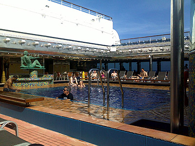 10.7.2010 - Dnes nás už podruhé na naší plavbě čeká celý den na moři. Na fotbalovém MS právě začíná utkání o 3.místo, takže je na 9.palubě u velkoplošné obrazovky docela plno. A protože jsme na americkém kontinentu, fandí se převážně Uruguayi...