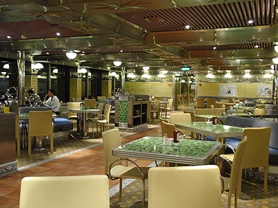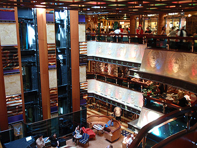 Večer vyrážíme na poslední zevrubnou procházku po lodi. Začít asi nelze nikde jinde, než v baru na American Lobby na 3.palubě (úplně dole). O patro výš je fotogalerie (mnozí spolucestující se během plavby nechali fotit všude a se vším) a ještě výš je obchodní korzo.