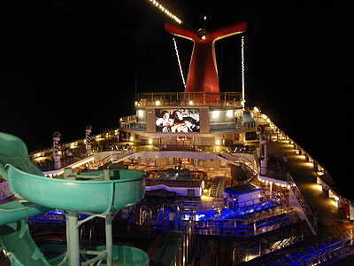 Večer se 9.paluba rozzářila naplno. V osm hodin začínalo kino, které se dalo sledovat z lehátka nebo třeba přímo z bazénu...