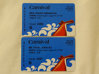 Jedním z nejdůležitějších artefaktů na lodi byla tato Sail & Sign Card. Během celé plavby sloužila jako klíč od pokoje, lodní lístek a také jako kreditní karta. Pomocí pasažérského čísla (folio v dolní části karty) šly z pohodlí naší kajuty objednávat výlety nebo třeba večeře s donáškou...