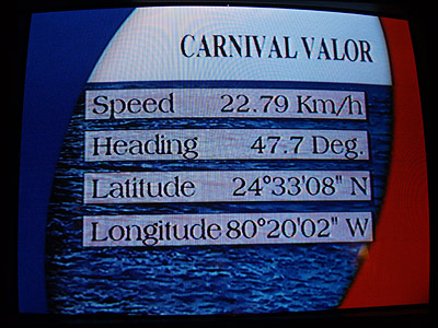 Na naší interaktivní TV opět kontrolujeme aktuální polohu lodi. Jak vidno podle severní šířky (Latitude), jsme již o více než jeden stupeň severně od obratníku Raka a tedy zpět v subtropickém podnebném pásmu.