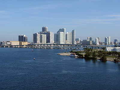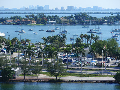 11.7.2010 - V sedm hodin ráno jsme připluli zpátky do Miami. Vylodění téměř 3000 pasažérů zabere poměrně dlouhý čas, tak si čekání krátíme na 9.palubě, odkud jsou nádherné výhledy na město.