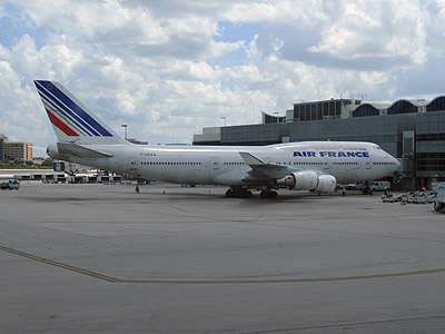 Po abslovování dlouhé fronty na pasové kontrole jsme vyrazili taxíkem rovnou na letiště (dohromady 20USD). Toto je náš Boeing 747-400 společnosti Air France, se kterým jsme se v 17:40 odlepili od americké pevniny. Osm hodin dlouhý neklidný let vyvrcholil neopakovatelným přístáním v Paříži uprostřed bouřky. Klesání na runway s blesky za křídly bylo dalším zajímavým zážitkem naší cesty. Tím posledním byl krásný přelet Bodamského jezera a úžasný výhled na Vídeň během závěrečného přeletu s Austrian Airlines.